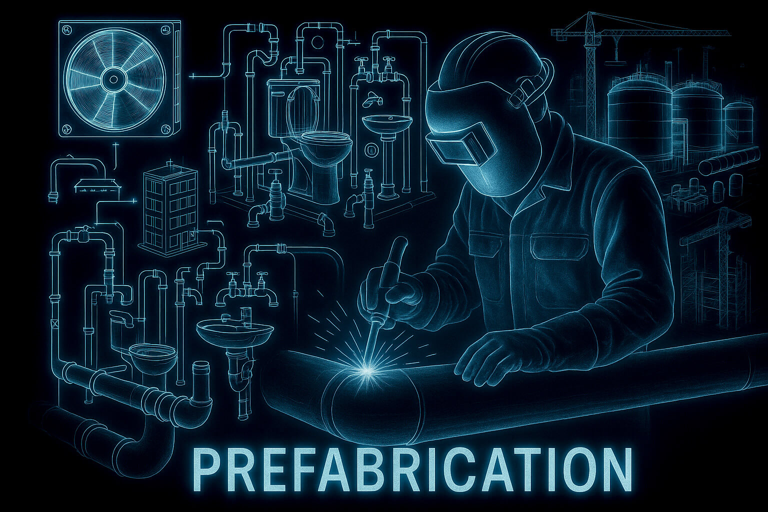 Our prefabrication covers building services engineering (cooling/heating), plant room construction, and industrial piping systems.