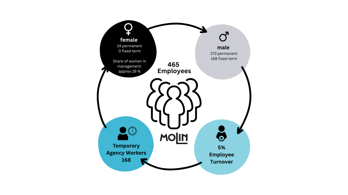 Our employees are the heart of Molin. Their knowledge, commitment, and team spirit form the foundation of our success. That is why we create conditions that promote health, enable development, and strengthen collaboration.